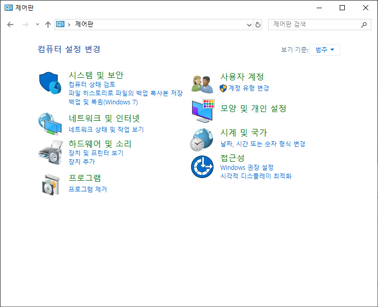 검색 후 나타나는 제어판 아이콘을 클릭하면 '제어판'이 실행된다.