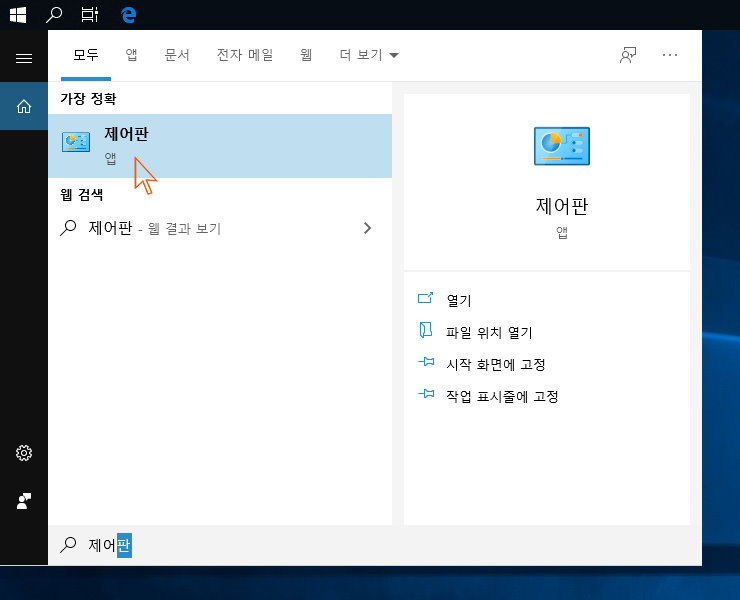 이렇게 하면 '제어판'이 작업표시줄에 고정되어 다음부터는 검색 없이 바로 실행할 수 있다.